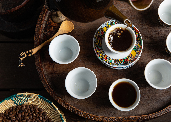 During the tour we will also stop at a small shop for a contemporary coffee ceremony – a practice fundamental to the fabric of Ethiopian society. The beans are roasted, ground by hand using mortar and pestle, then brewed over the coals in a clay pot known as a jebena. Three cups of coffee are poured out, each with Biblical names, finishing with ‘the blessing’.